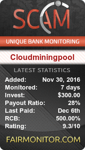 Cloudminingpool была основана в 2016 году в Гонконге, мы являемся инвестиционной компанией, которая занимается в обмен криптовалюта, Bitcoin горнодобывающей промышленности и торговли иностранной валютой. С клиентами со всего мира, Cloudminingpool управляет профессиональный форекс трейдеров команды и добычи Bitcoin команды. Мы также в разгар развития инновационной криптовалюта обмена торговой программы. Проверенная в нашем успехе, мы являемся компанией, которой доверяют во всем мире. Мы наблюдали сертифицированных мониторов HYIP, и мы гарантируем, каждый инвестиции мы делаем это в лучшем положении для наших клиентов.