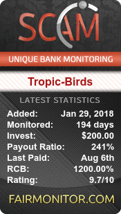 Tropic-Birds - увлекательная экономическая онлайн игра с выводом денег. Пользователям необходимо покупать различных птиц, птицы будут вам приносить яйца которые нужно собирать и продавать. Продавая яйца вы получаете серебро на счет для выплаты, серебро вы можете мгновенно вывести на множество популярных платежных систем!